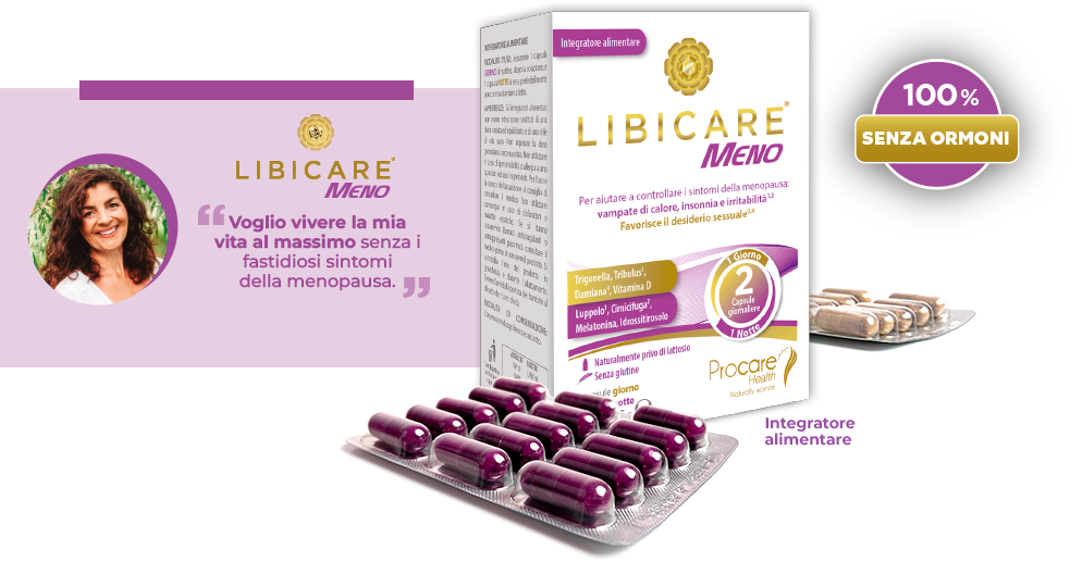 Libicare® Meno è un integratore alimentare dalla formulazione innovativa, composto esclusivamente da ingredienti di origine naturale. Studi clinici e dati raccolti da fonti autorevoli indicano che fino al 95% delle donne ha riscontrato una riduzione significativa nella frequenza e nell’intensità delle vampate di calore già dopo tre mesi di utilizzo continuativo. Grazie alla sua efficacia dimostrata, Libicare® Meno rappresenta una soluzione naturale e sicura per affrontare i sintomi più comuni e fastidiosi della menopausa, migliorando il benessere generale e la qualità della vita.